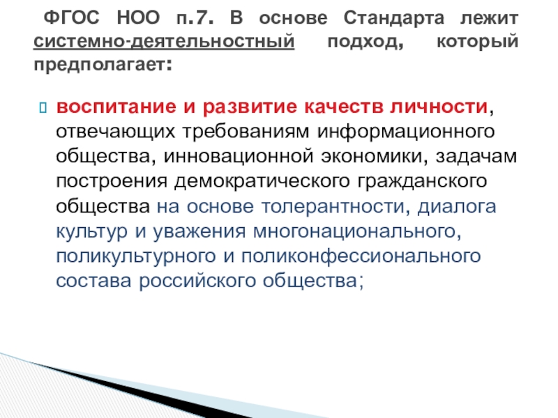 ФГОС НОО п.7. В основе Стандарта лежит системно-деятельностный подход, который предполагает: