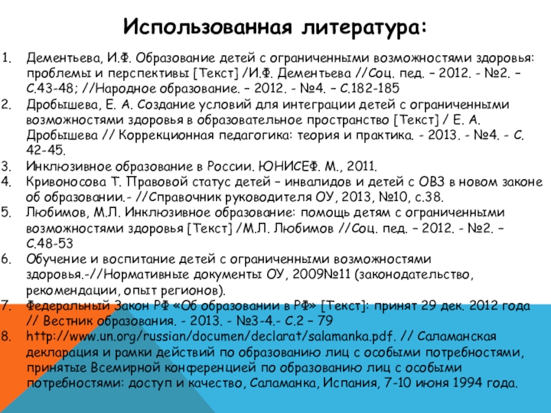 http://www.un.org/russian/documen/declarat/salamanka.pdf. // Саламанская декларация и рамки действий по образованию лиц с особыми потребностями, принятые Всемирной конференцией по образованию лиц с особыми потребностями: доступ и качество, Саламанка, Испания, 7-10 июня 1994 года.