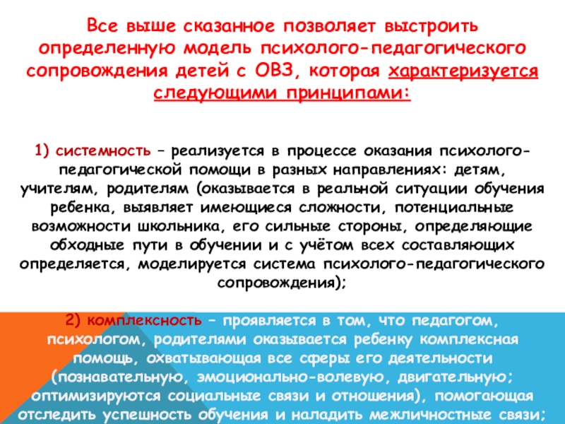 1) системность – реализуется в процессе оказания психолого-педагогической помощи в разных направлениях: детям, учителям, родителям (оказывается в реальной ситуации обучения ребенка, выявляет имеющиеся сложности, потенциальные возможности школьника, его сильные стороны, определяющие обходные пути в обучении и с учётом всех составляющих определяется, моделируется система психолого-педагогического сопровождения);