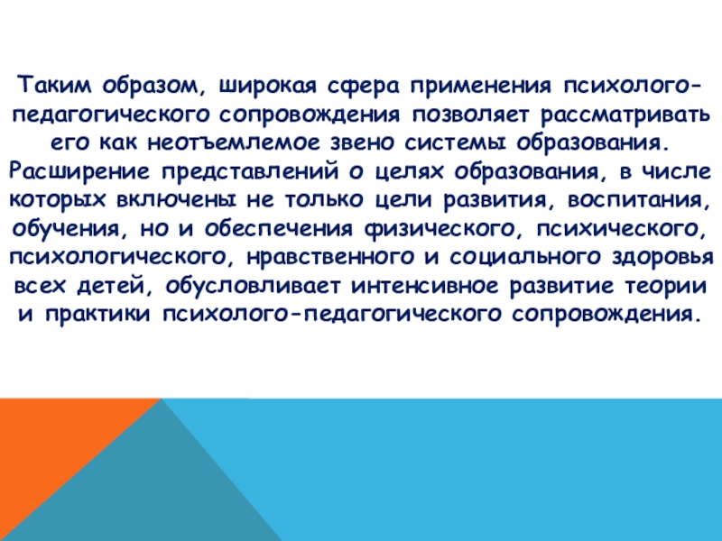 Слайд 26Таким образом, широкая сфера применения психолого-педагогического сопровождения позволяет рассматривать его как