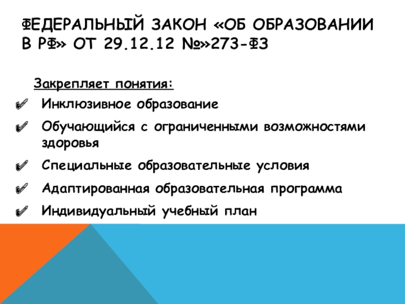 Слайд 4Федеральный закон «Об образовании в РФ» от 29.12.12 №»273-ФЗ