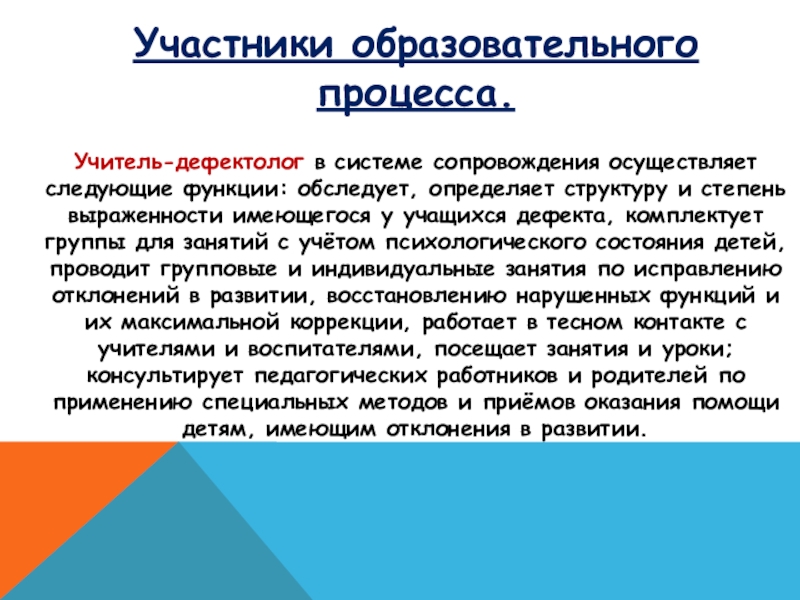 Учитель-дефектолог в системе сопровождения осуществляет следующие функции: обследует, определяет