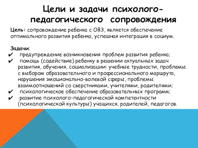 Слайд 10Цель: сопровождение ребенка с ОВЗ, является обеспечение оптимального развития ребенка, успешная