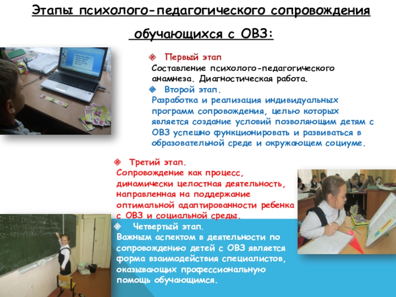 Разработка и реализация индивидуальных программ сопровождения, целью которых является создание условий позволяющим детям с ОВЗ успешно функционировать и развиваться в образовательной среде и окружающем социуме.