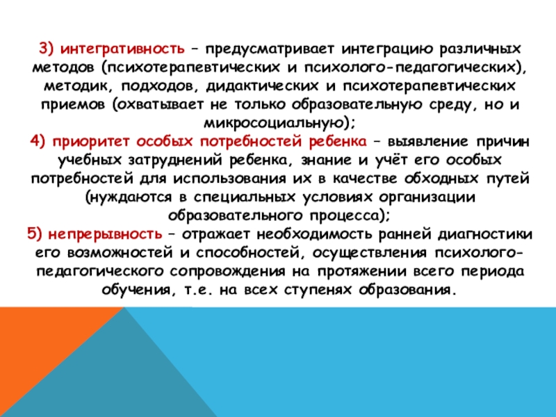 4) приоритет особых потребностей ребенка – выявление причин учебных затруднений ребенка, знание и учёт его особых потребностей для использования их в качестве обходных путей (нуждаются в специальных условиях организации образовательного процесса);