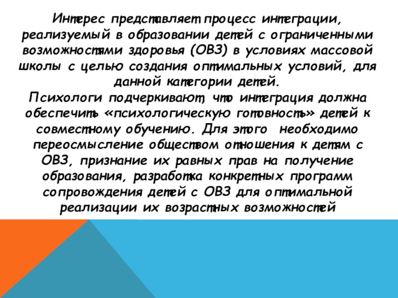 Слайд 7Интерес представляет процесс интеграции, реализуемый в образовании детей с ограниченными возможностями