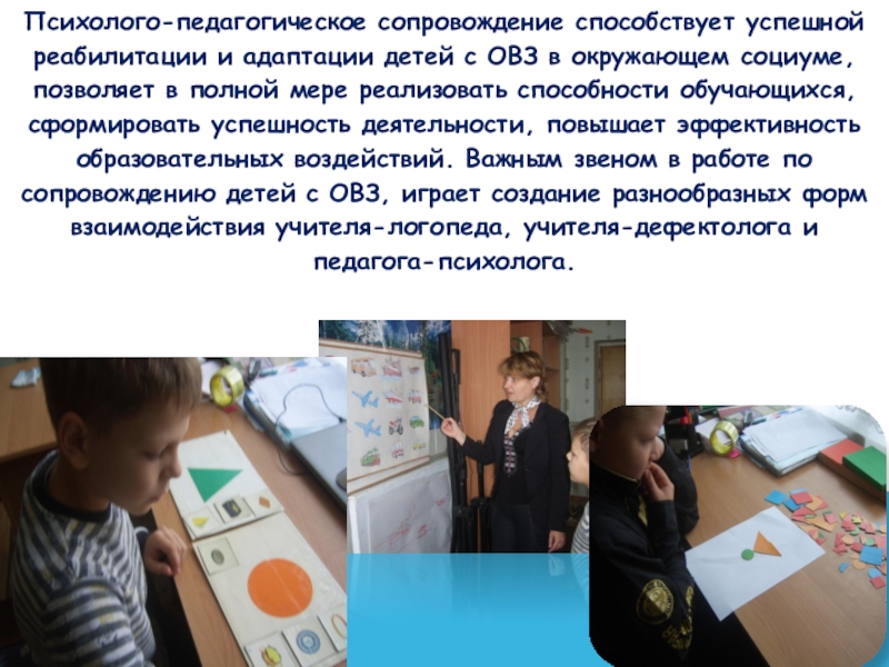 окружающем социуме, позволяет в полной мере реализовать способности обучающихся, сформировать успешность деятельности, повышает эффективность образовательных воздействий. Важным звеном в работе по сопровождению детей с ОВЗ, играет создание разнообразных форм взаимодействия учителя-логопеда, учителя-дефектолога и педагога-психолога.