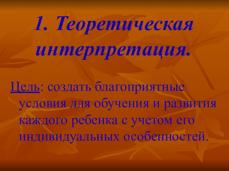 1. Теоретическая интерпретация.Цель: создать благоприятные условия для обучения и развития каждого ребенка с учетом его индивидуальных особенностей.