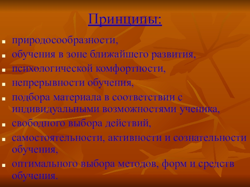 Принципы:природосообразности,обучения в зоне ближайшего развития,психологической комфортности,непрерывности обучения,подбора материала в соответствии с индивидуальными возможностями ученика,свободного выбора действий,самостоятельности, активности