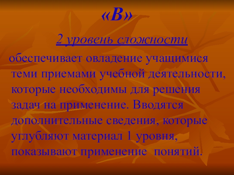 «В»  2 уровень сложности обеспечивает овладение учащимися теми приемами учебной деятельности, которые необходимы для решения задач