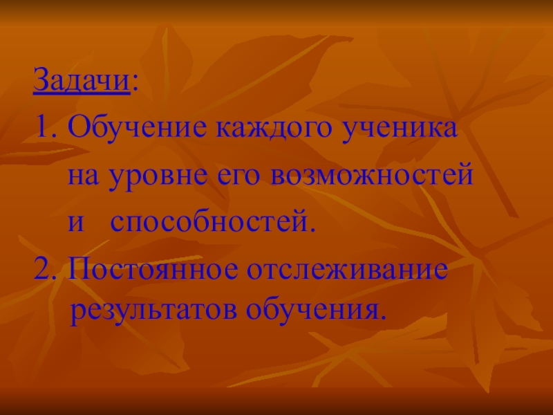 Задачи:1. Обучение каждого ученика   на уровне его возможностей   и  способностей.2. Постоянное отслеживание