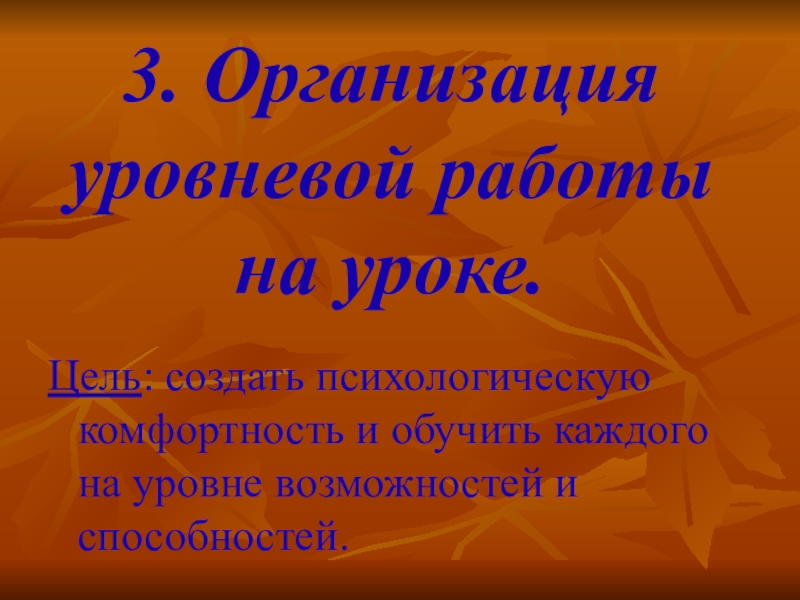 3. Организация уровневой работы на уроке.Цель: создать психологическую комфортность и обучить каждого на уровне возможностей и способностей.