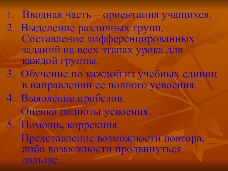 1.  Вводная часть – ориентация учащихся.2. Выделение различных групп. Составление дифференцированных заданий на всех этапах урока