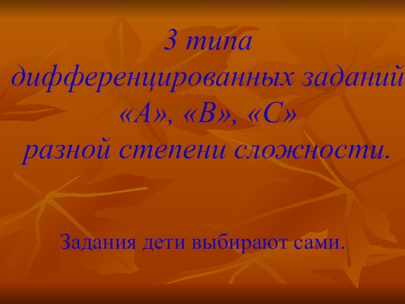 3 типа  дифференцированных заданий «А», «В», «С»  разной степени сложности.Задания дети выбирают сами.