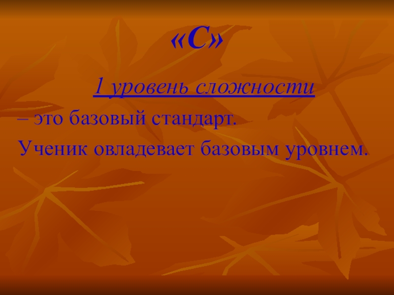 «С»1 уровень сложности – это базовый стандарт. Ученик овладевает базовым уровнем.