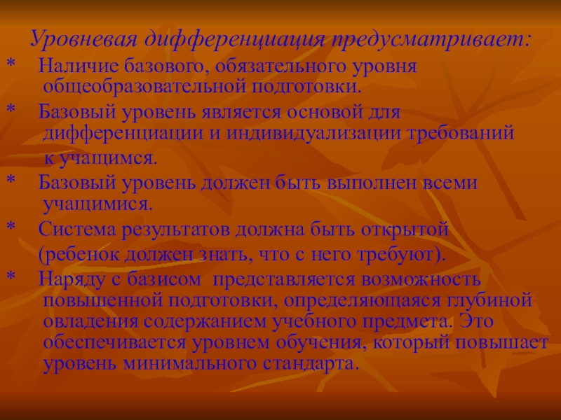 Уровневая дифференциация предусматривает:*  Наличие базового, обязательного уровня общеобразовательной подготовки.*  Базовый уровень является основой для дифференциации