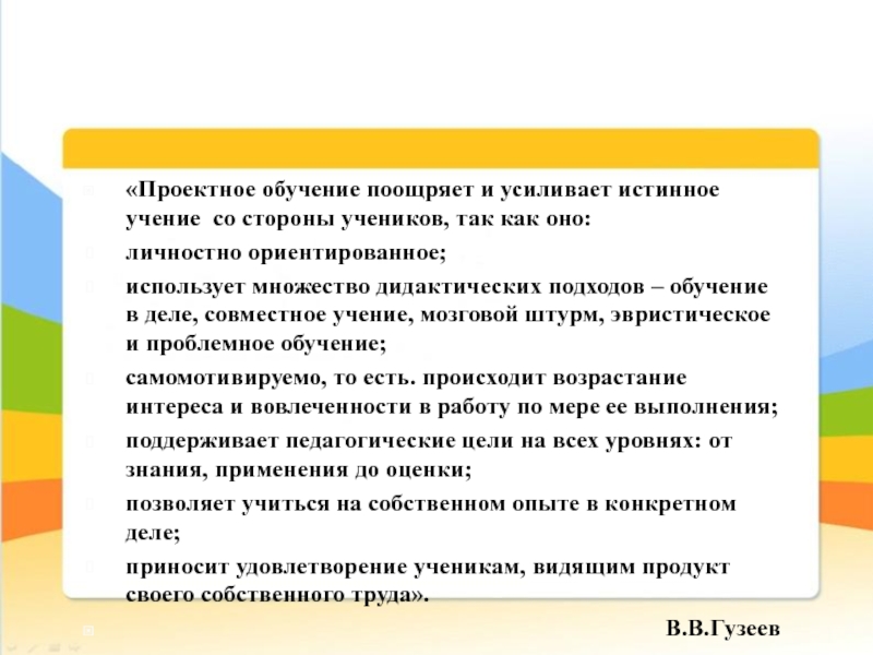 Слайд 5«Проектное обучение поощряет и усиливает истинное учение со стороны учеников, так