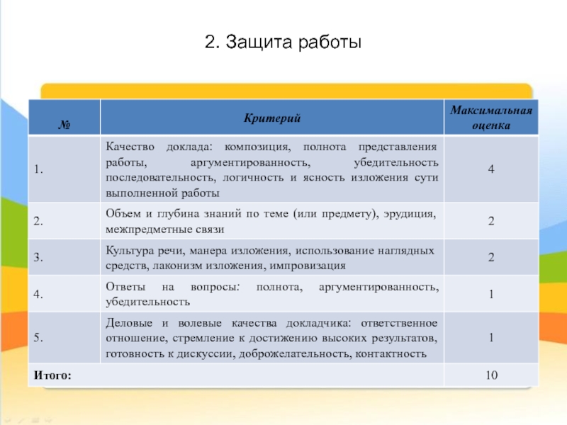 - уровень организации и проведения презентации: устного сообщения, письменного отчёта, обеспечения объёктами наглядности;