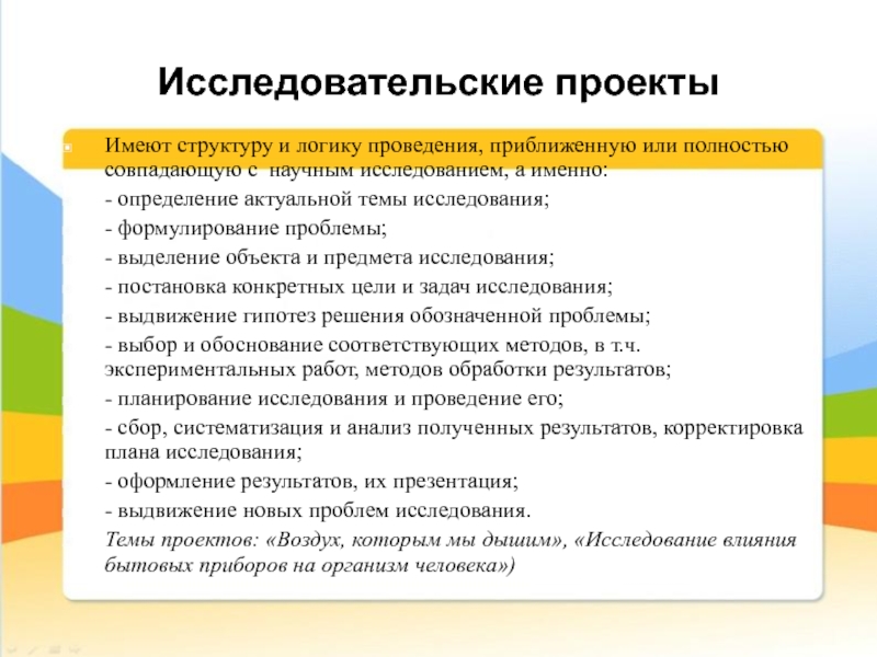 Темы проектов: «Воздух, которым мы дышим», «Исследование влияния бытовых приборов на организм человека»)