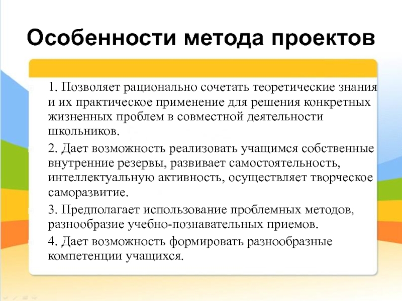Слайд 4Особенности метода проектов