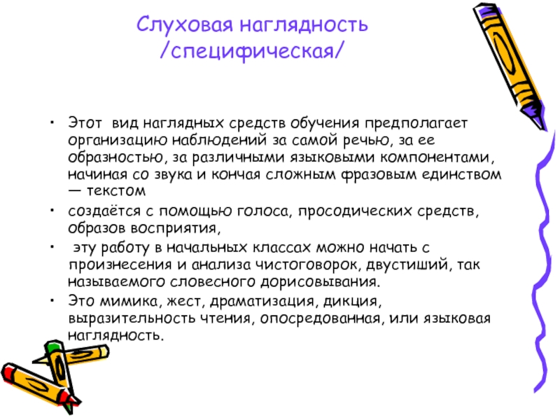 Это мимика, жест, драматизация, дикция, выразительность чтения, опосредованная, или языковая наглядность.