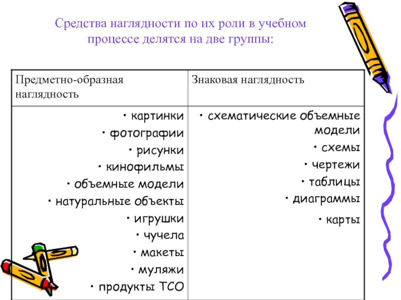 Слайд 9Средства наглядности по их роли в учебном процессе делятся на две