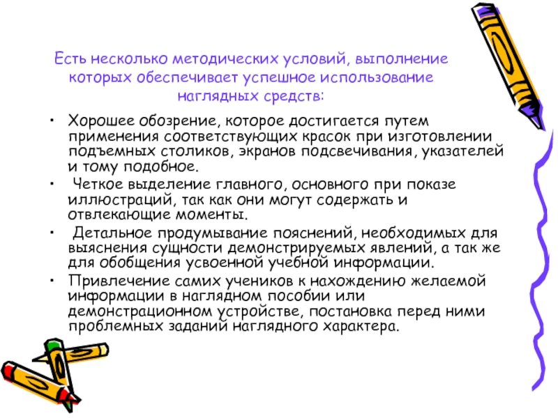 Слайд 7Есть несколько методических условий, выполнение которых обеспечивает успешное использование наглядных средств: