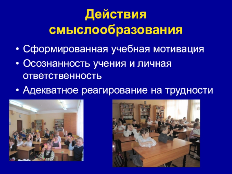 Действия  смыслообразованияСформированная учебная мотивацияОсознанность учения и личная ответственностьАдекватное реагирование на трудности