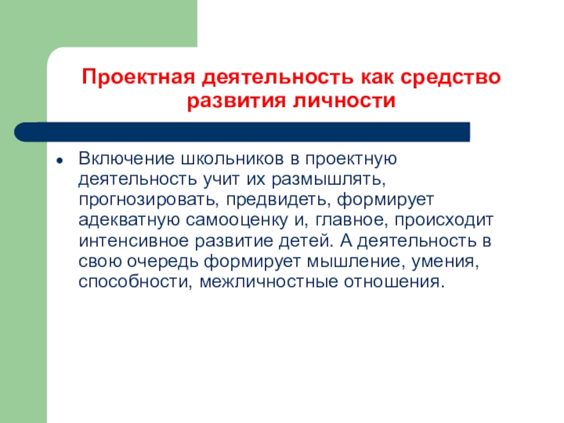 Проектная деятельность как средство развития личностиВключение школьников в проектную деятельность учит их размышлять, прогнозировать, предвидеть, формирует адекватную