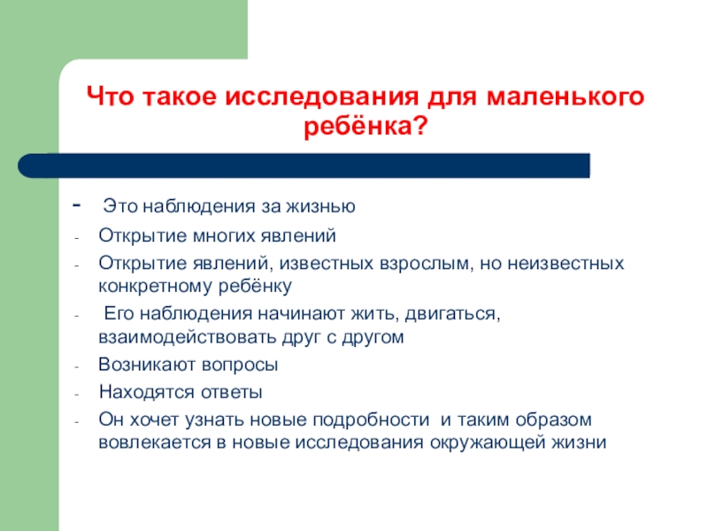 Что такое исследования для маленького ребёнка?-  Это наблюдения за жизньюОткрытие многих явленийОткрытие явлений, известных взрослым, но