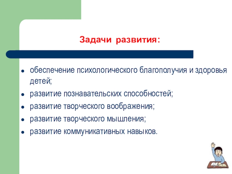 Задачи развития:обеспечение психологического благополучия и здоровья детей;развитие познавательских способностей;развитие творческого воображения;развитие творческого мышления;развитие коммуникативных навыков.