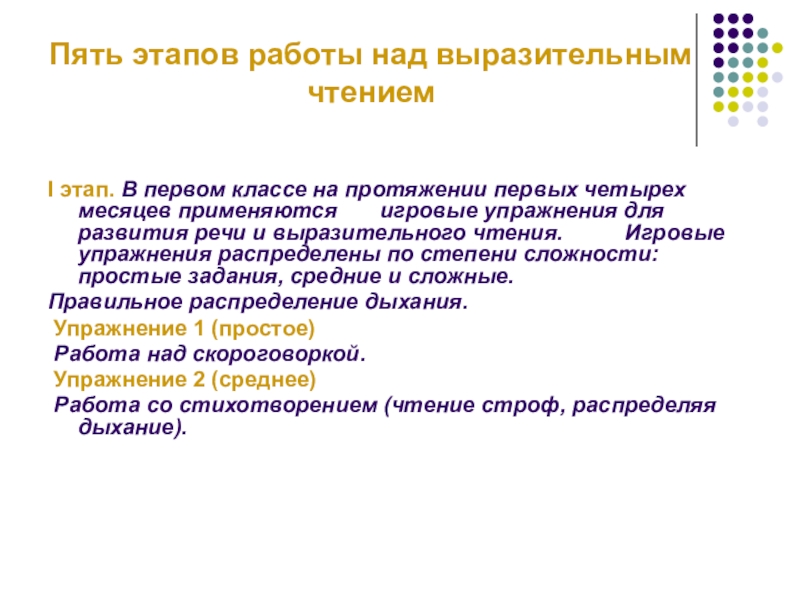 на протяжении первых четырех месяцев применяются игровые упражнения для развития речи и выразительного чтения. Игровые упражнения распределены по степени сложности: простые задания, средние и сложные.