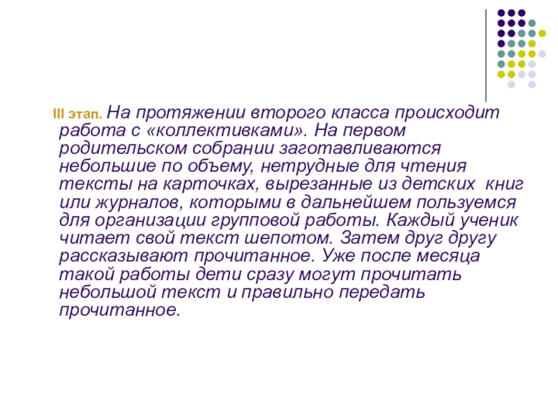 «коллективками». На первом родительском собрании заготавливаются небольшие по объему, нетрудные для чтения тексты на карточках, вырезанные из детских книг или журналов, которыми в дальнейшем пользуемся для организации групповой работы. Каждый ученик читает свой текст шепотом. Затем друг другу рассказывают прочитанное. Уже после месяца такой работы дети сразу могут прочитать небольшой текст и правильно передать прочитанное.