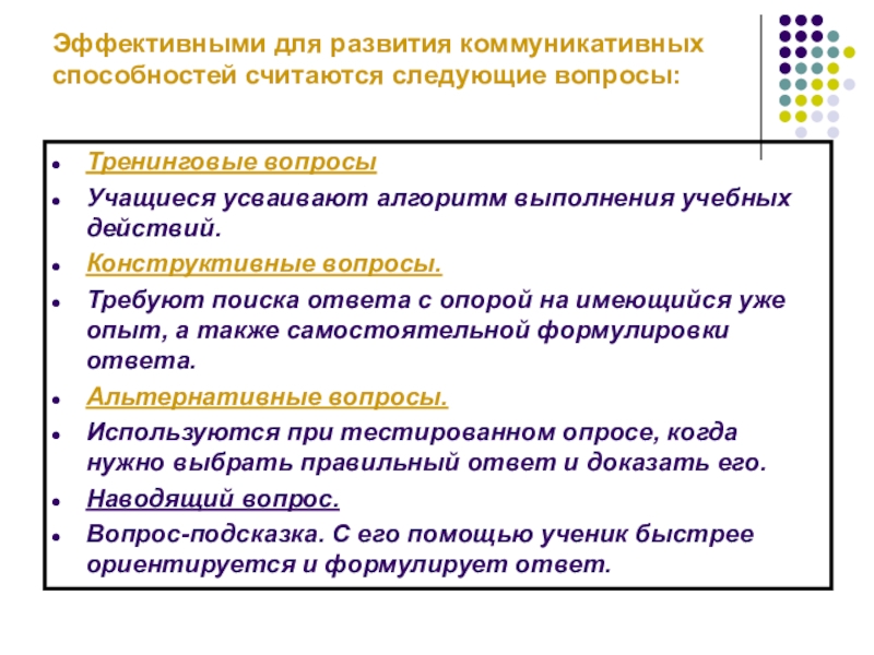 Слайд 19Эффективными для развития коммуникативных способностей считаются следующие вопросы: