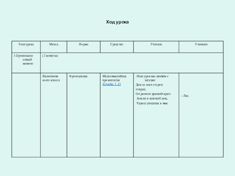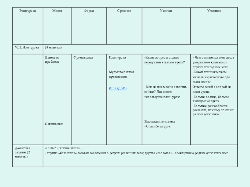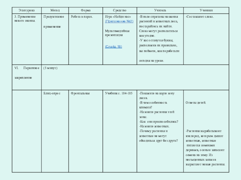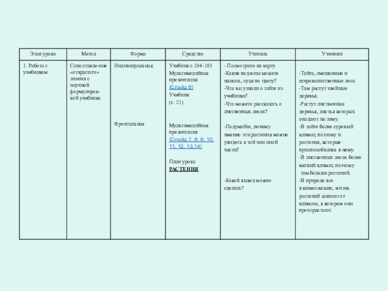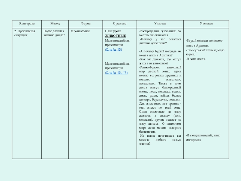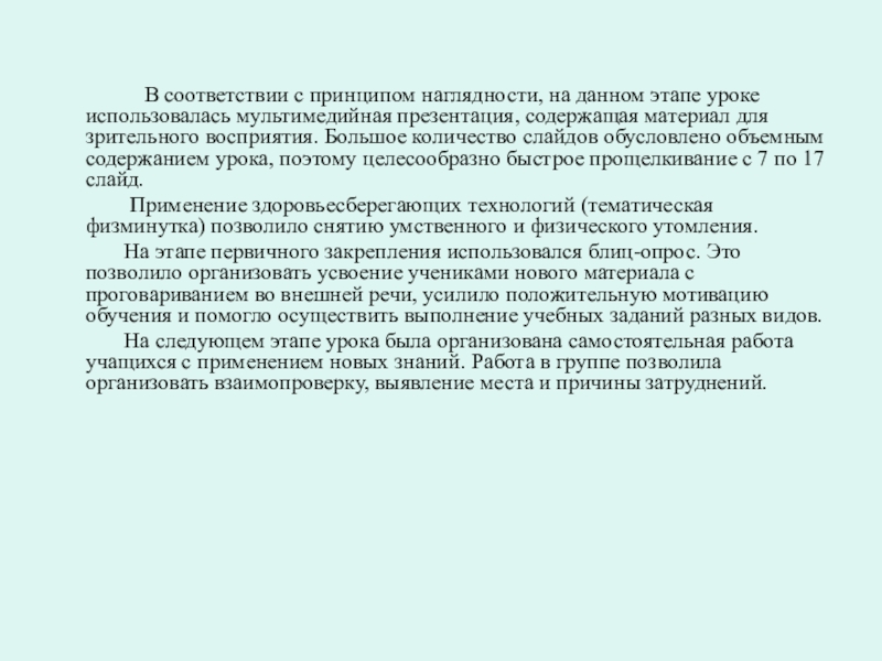 принципом наглядности, на данном этапе уроке использовалась мультимедийная презентация, содержащая материал для зрительного восприятия. Большое количество слайдов обусловлено объемным содержанием урока, поэтому целесообразно быстрое прощелкивание с 7 по 17 слайд.