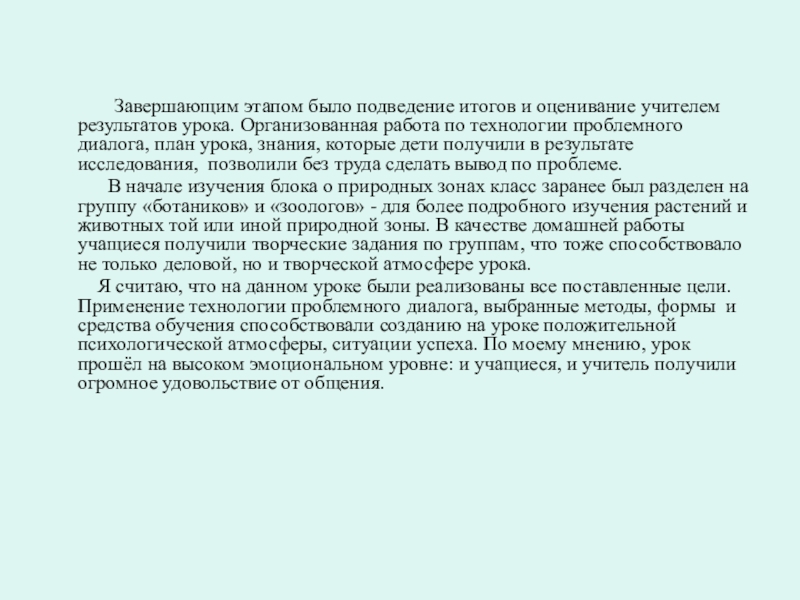 Я считаю, что на данном уроке были реализованы все поставленные цели. Применение технологии проблемного диалога, выбранные методы, формы и средства обучения способствовали созданию на уроке положительной психологической атмосферы, ситуации успеха. По моему мнению, урок прошёл на высоком эмоциональном уровне: и учащиеся, и учитель получили огромное удовольствие от общения.