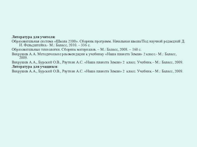 Вахрушев А.А., Бурский О.В., Раутиан А.С. «Наша планета Земля» 2 класс. Учебник.– М.: Баласс, 2009.