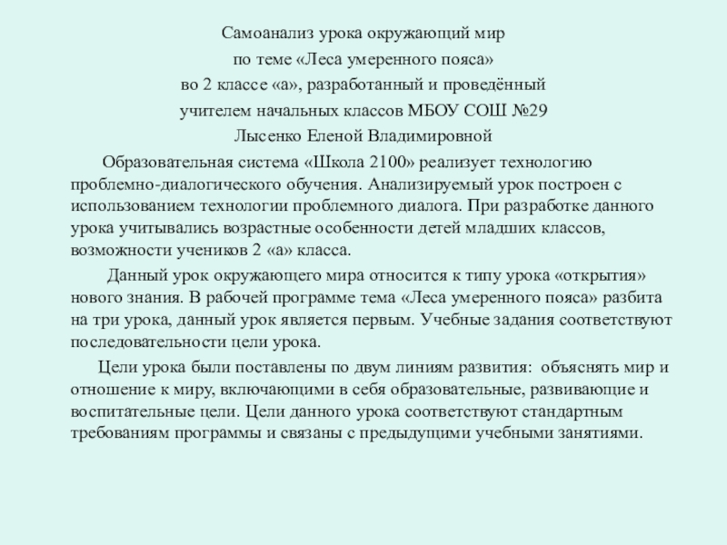 Образовательная система «Школа 2100» реализует технологию проблемно-диалогического обучения. Анализируемый урок построен с использованием технологии проблемного диалога. При разработке данного урока учитывались возрастные особенности детей младших классов, возможности учеников 2 «а» класса.