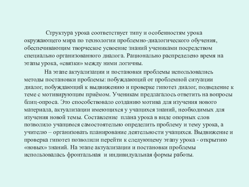 типу и особенностям урока окружающего мира по технологии проблемно-диалогического обучения, обеспечивающим творческое усвоение знаний учениками посредством специально организованного диалога. Рационально распределено время на этапы урока, «связки» между ними логичны.