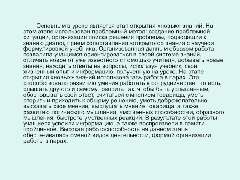 является этап открытия «новых» знаний. На этом этапе использован проблемный метод: создание проблемной ситуации, организация поиска решения проблемы, подводящий к знанию диалог, приём сопоставления «открытого» знания с научной формулировкой учебника. Организованная данным образом работа позволила учащимся ориентироваться в своей системе знаний, отличать новое от уже известного с помощью учителя, добывать новые знания, находить ответы на вопросы, используя учебник, свой жизненный опыт и информацию, полученную на уроке. На этапе открытия «новых» знаний использовалась работа в парах. Это способствовало развитию умения работать в сотрудничестве, то есть, слышать другого и самому говорить так, чтобы быть услышанным, обосновывать свой ответ, считаться с мнением товарища, уметь спорить и приходить к общему решению, уметь доброжелательно высказать свое мнение, выслушать мнение товарища, а также развитию логического мышления, умственных способностей, образного мышления, быстроте умственных реакций. В результате этой работы учащиеся усвоили информацию, а также воспроизвели в памяти пройденное. Высокая работоспособность на данном этапе обеспечивалась сменой видов деятельности, формой организации работы в парах.