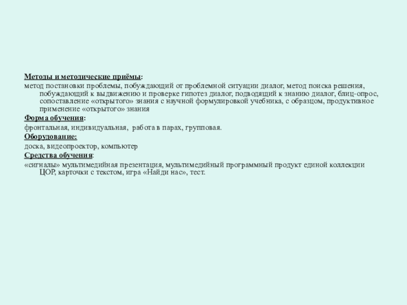«сигналы» мультимедийная презентация, мультимедийный программный продукт единой коллекции ЦОР, карточки с текстом, игра «Найди нас», тест.