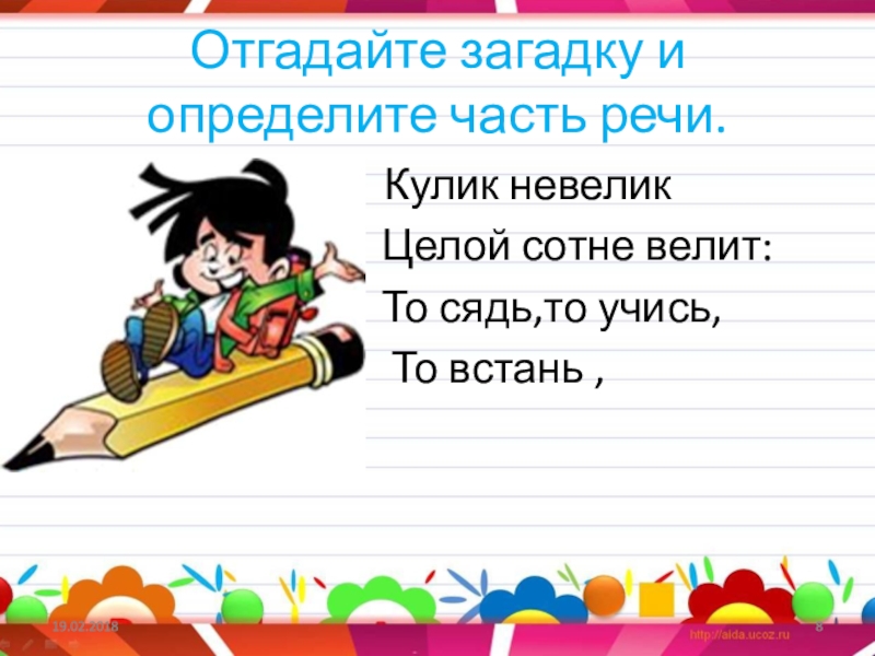 Слайд 8Отгадайте загадку и определите часть речи.