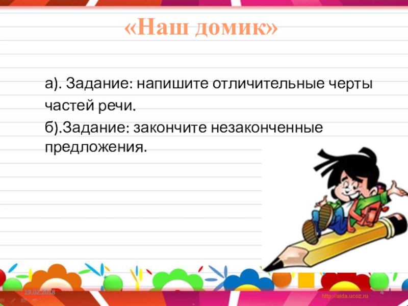 «Наш домик»а). Задание: напишите отличительные черты частей речи.б).Задание: закончите незаконченные предложения.