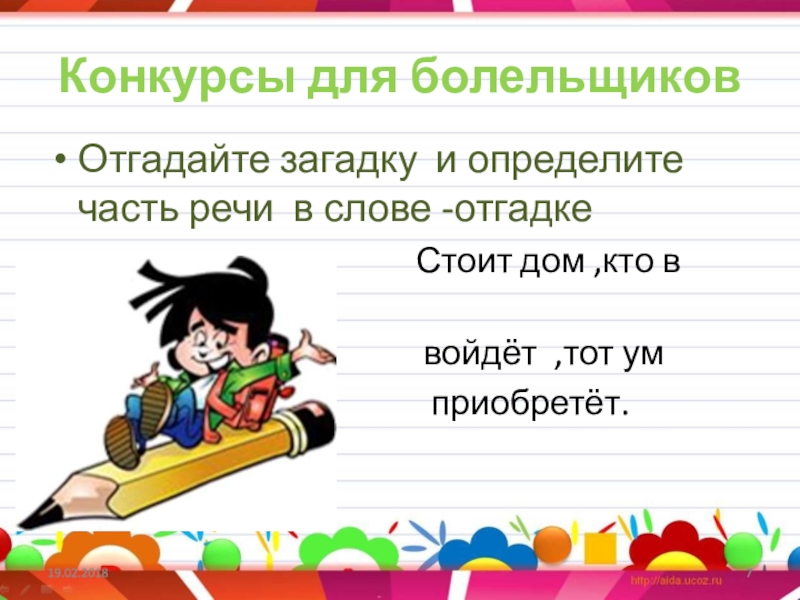 Конкурсы для болельщиковОтгадайте загадку и определите часть речи в слове -отгадке
