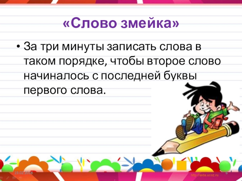 «Слово змейка»За три минуты записать слова в таком порядке, чтобы второе слово начиналось с последней буквы первого