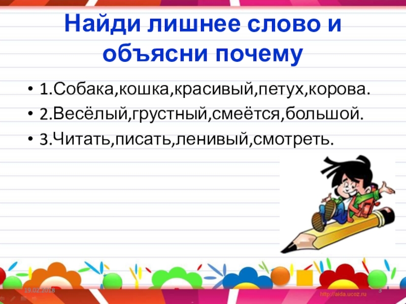 Найди лишнее слово и объясни почему1.Собака,кошка,красивый,петух,корова.2.Весёлый,грустный,смеётся,большой.3.Читать,писать,ленивый,смотреть.