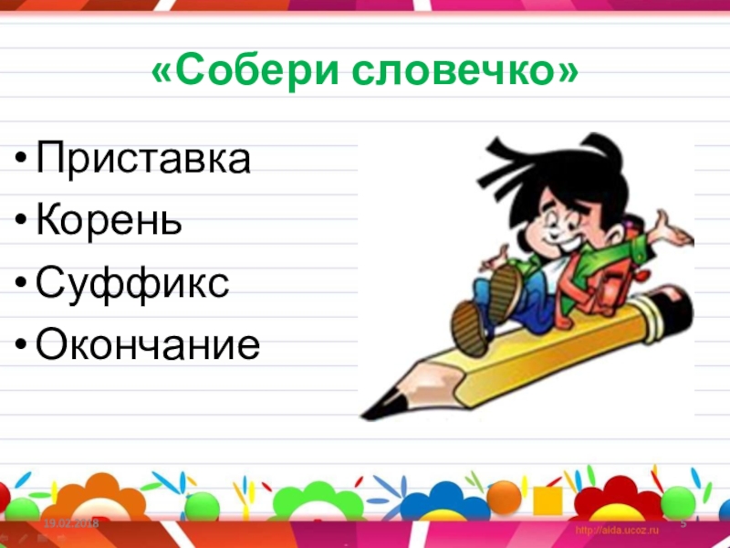 «Собери словечко»ПриставкаКореньСуффиксОкончание