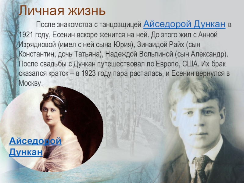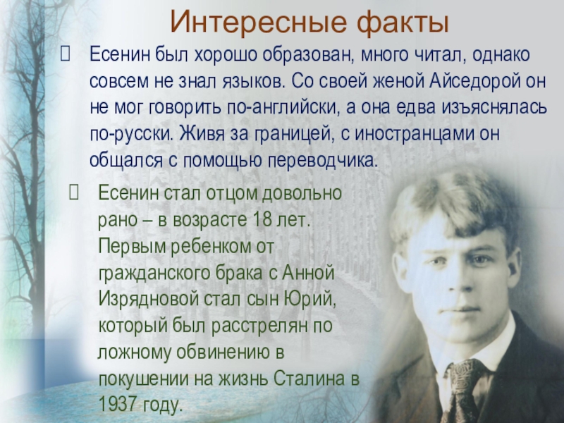 Есенин стал отцом довольно рано – в возрасте 18 лет. Первым ребенком от гражданского брака с Анной Изрядновой стал сын Юрий, который был расстрелян по ложному обвинению в покушении на жизнь Сталина в 1937 году.