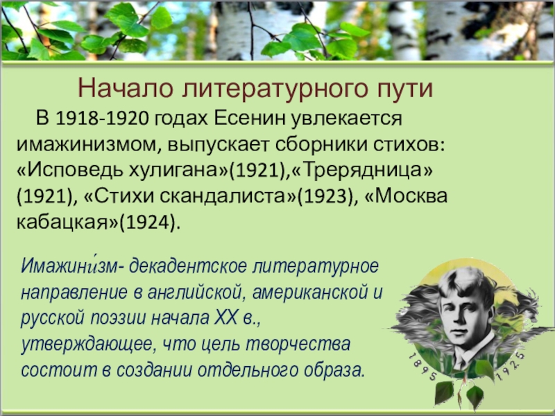Имажини́зм- декадентское литературное направление в английской, американской и русской поэзии начала XX в., утверждающее, что цель творчества состоит в создании отдельного образа.