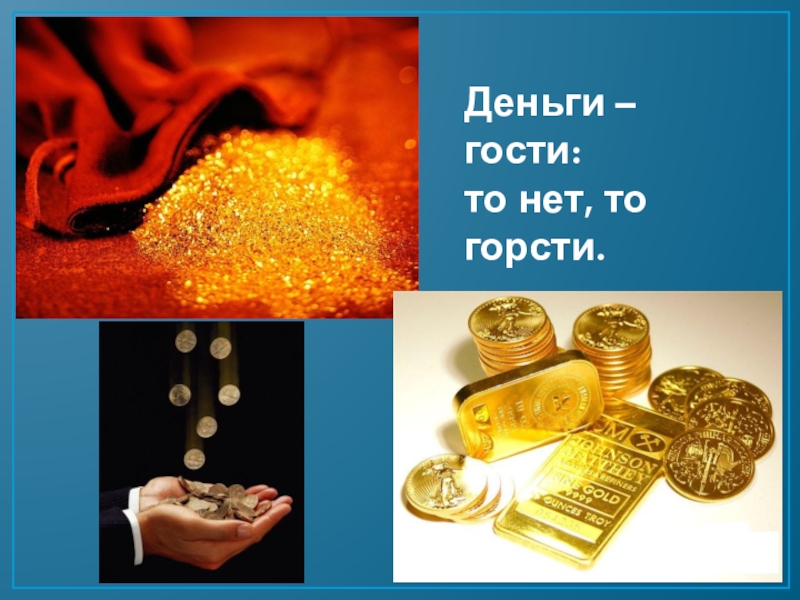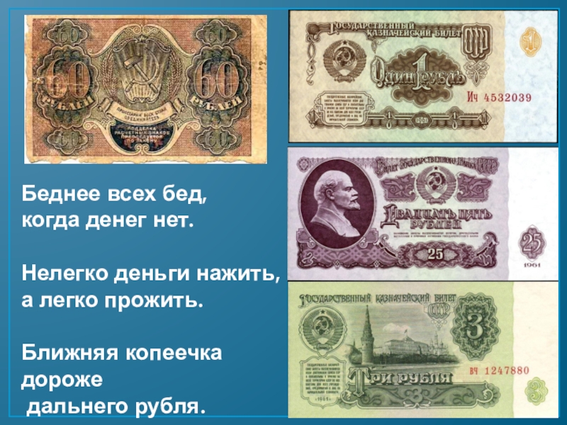 Беднее всех бед, когда денег нет.Нелегко деньги нажить, а легко прожить.Ближняя копеечка дороже дальнего рубля.
